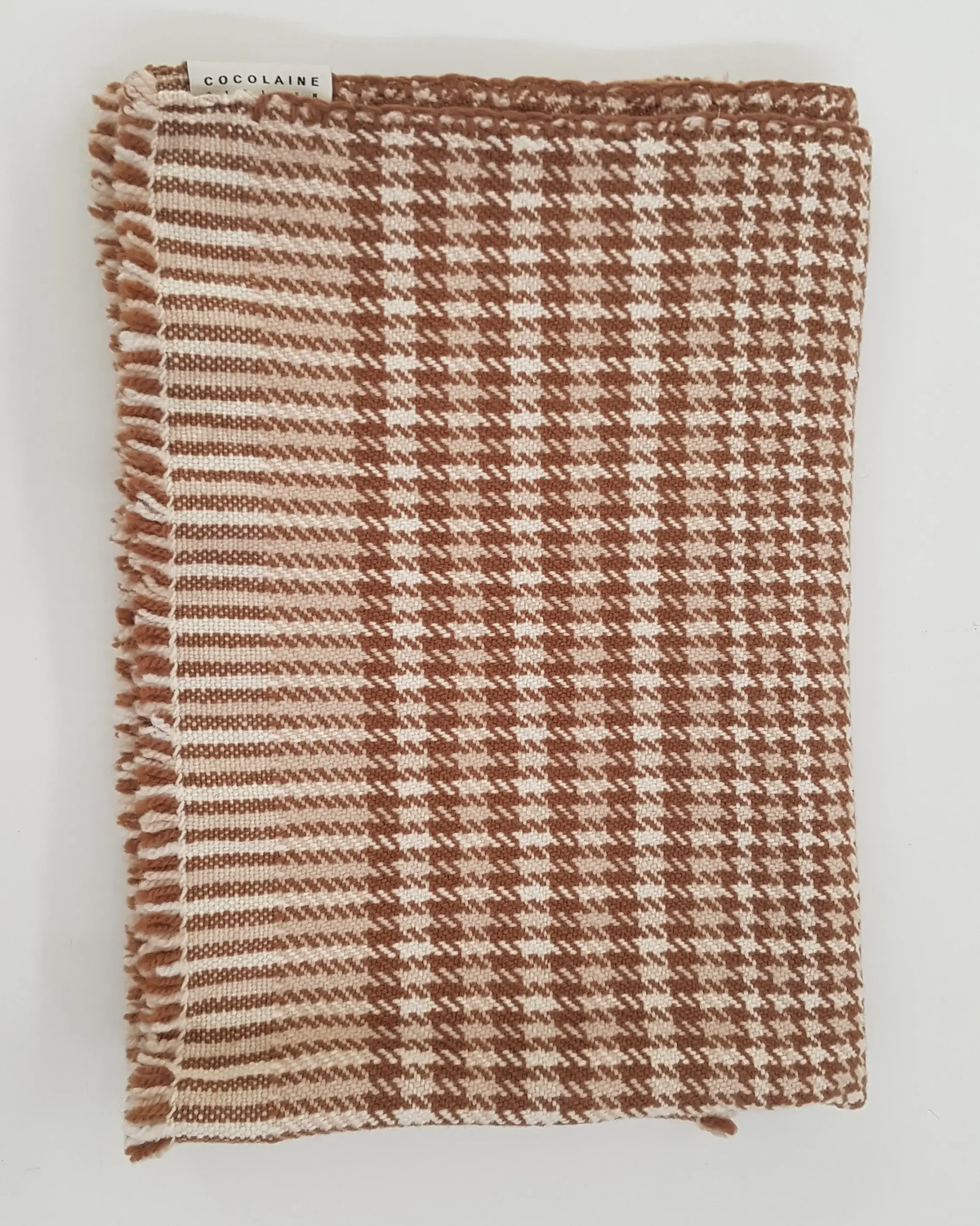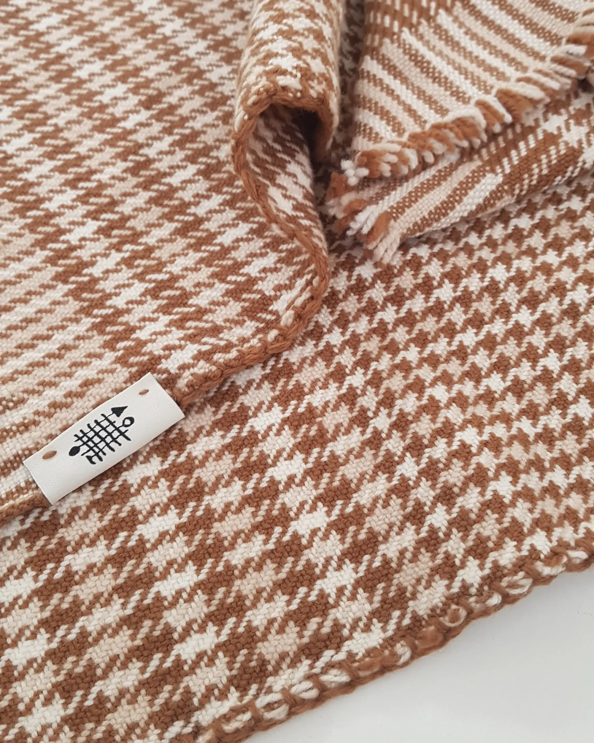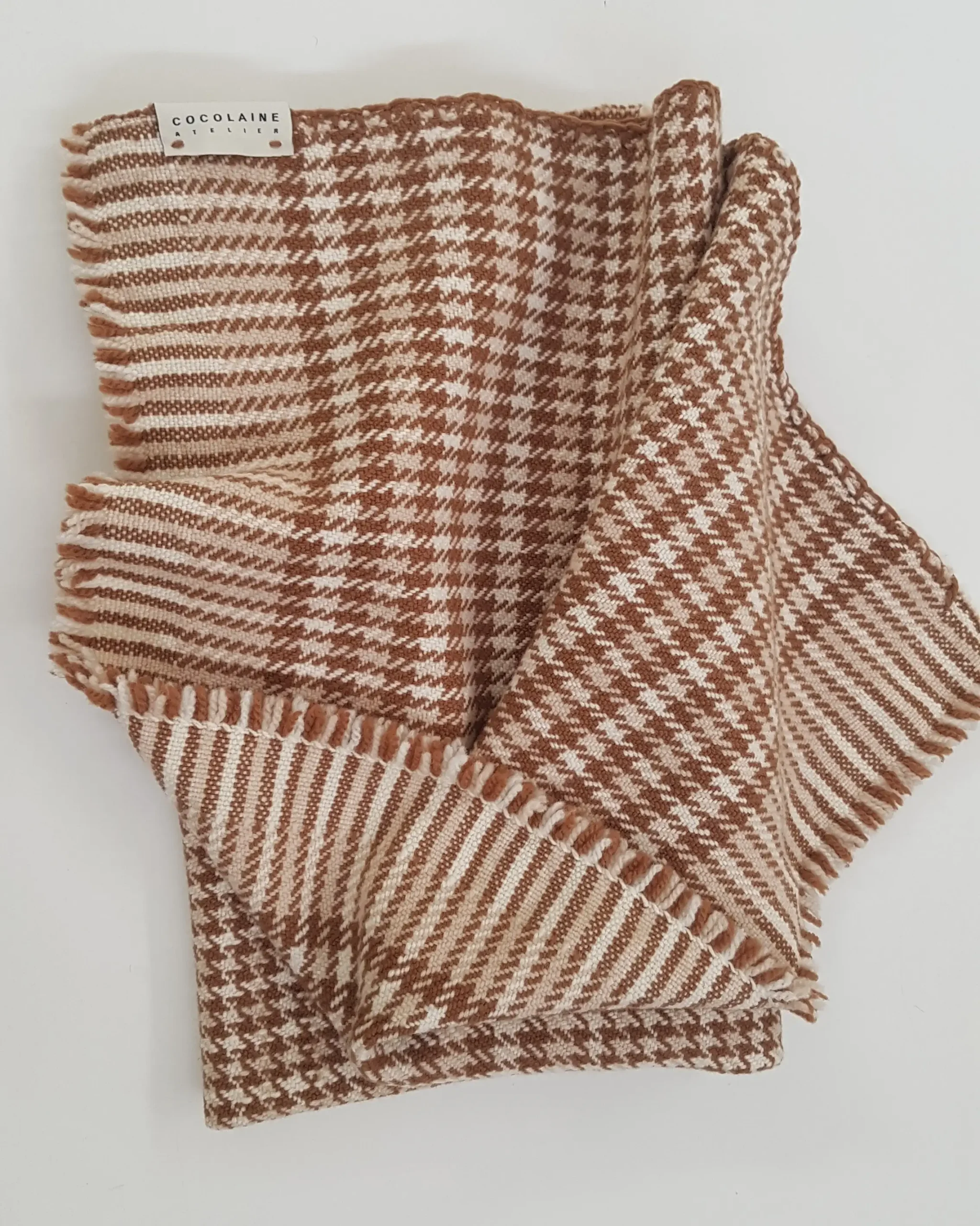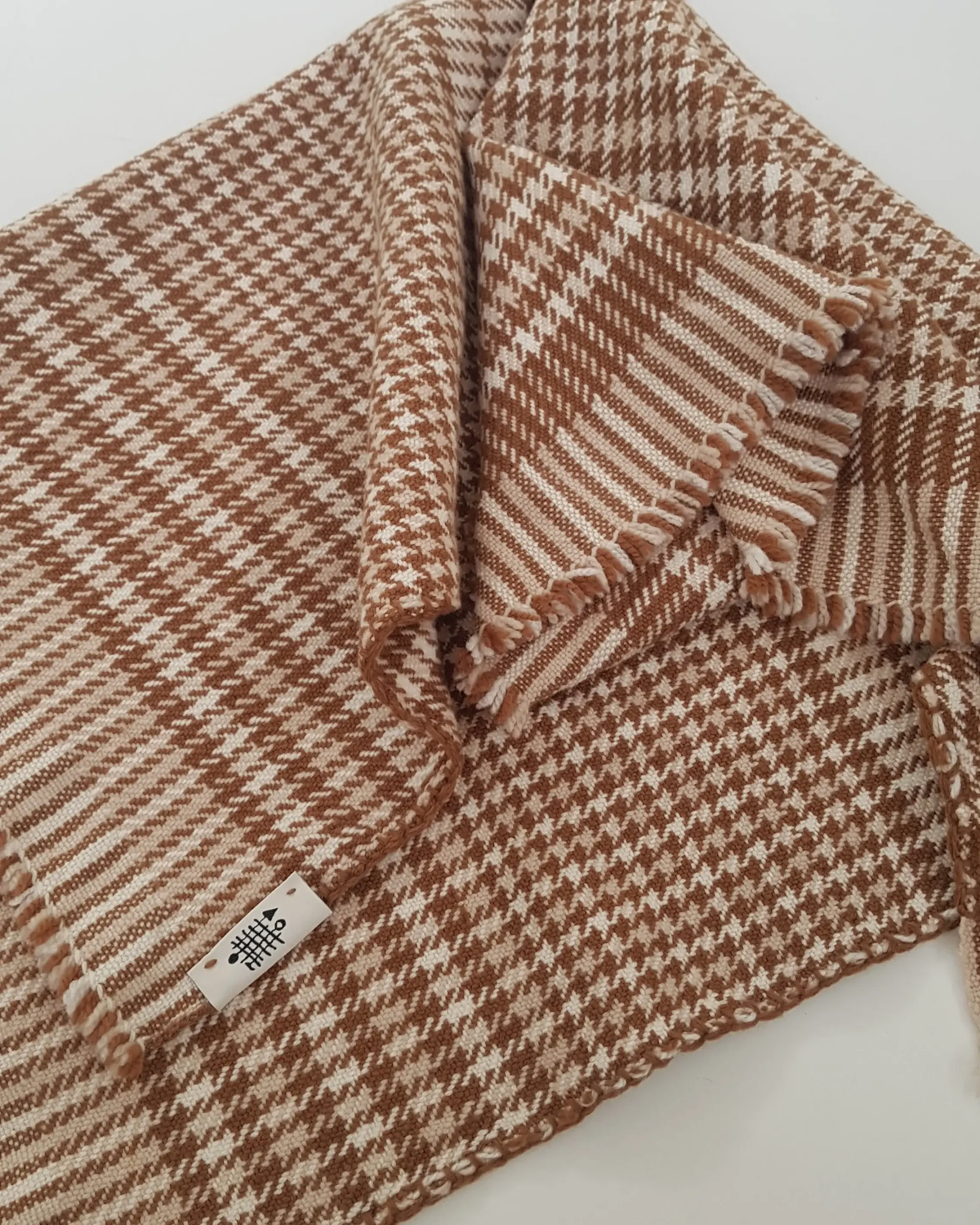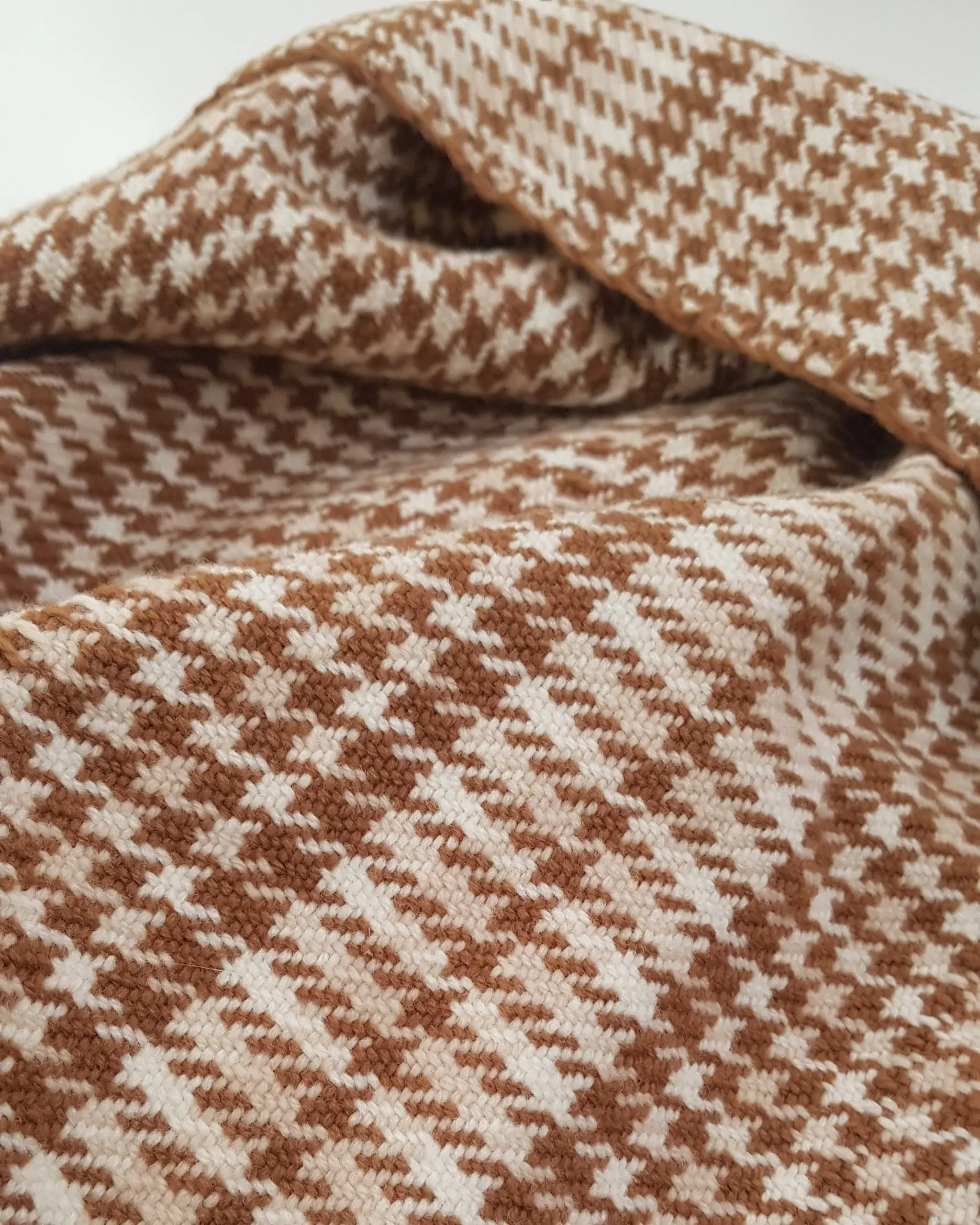 Le tissage révèle un élégant motif pied-de-poule aux teintes naturelles de brun et de crème.
