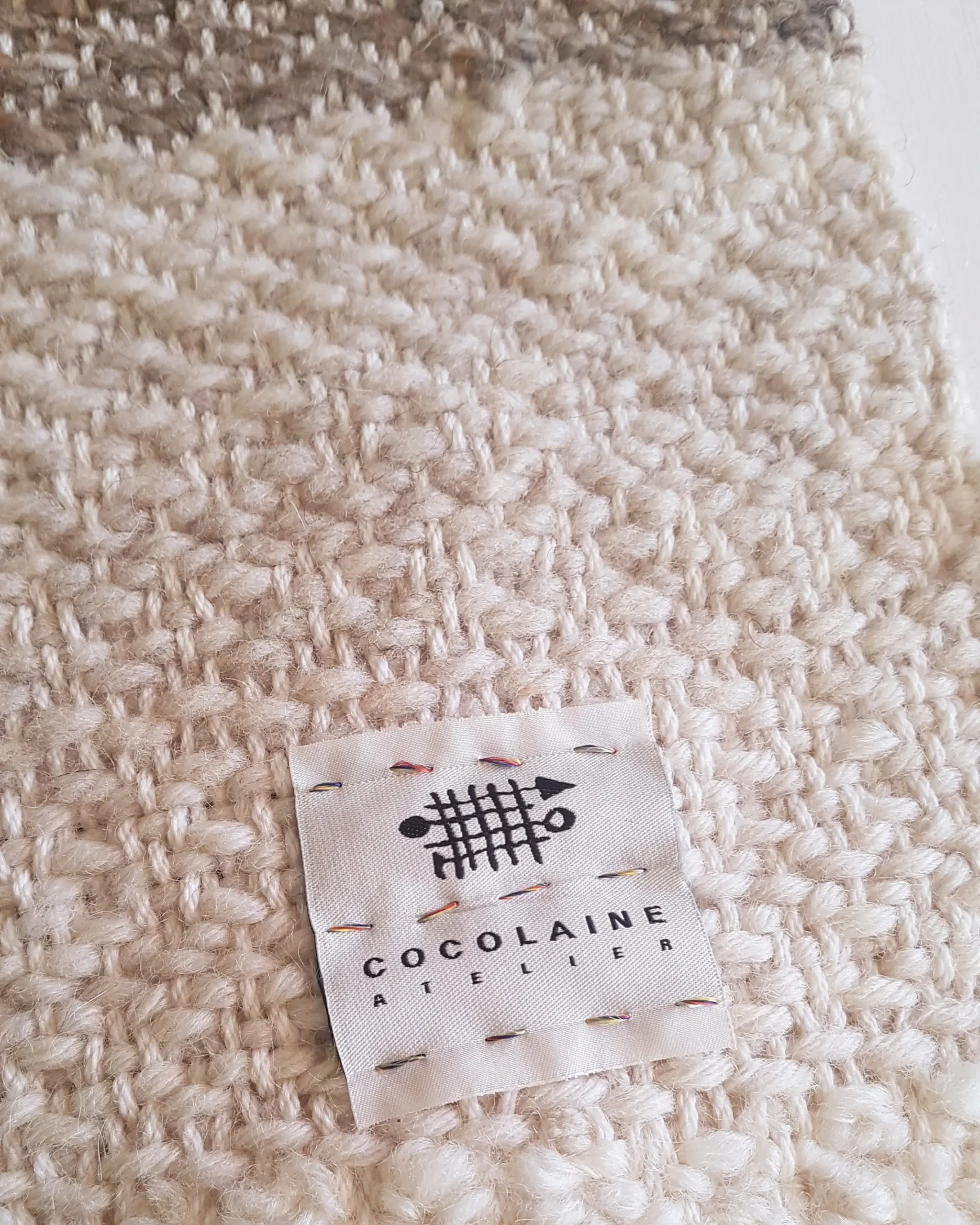 J’ai sélectionné de belles matières en camaïeu de beiges et de bruns naturels, qui évoquent la douceur d’un paysage de montagne. Le tissage marie la laine cardée brute, la délicatesse de la soie et le relief des bouclettes de laine.